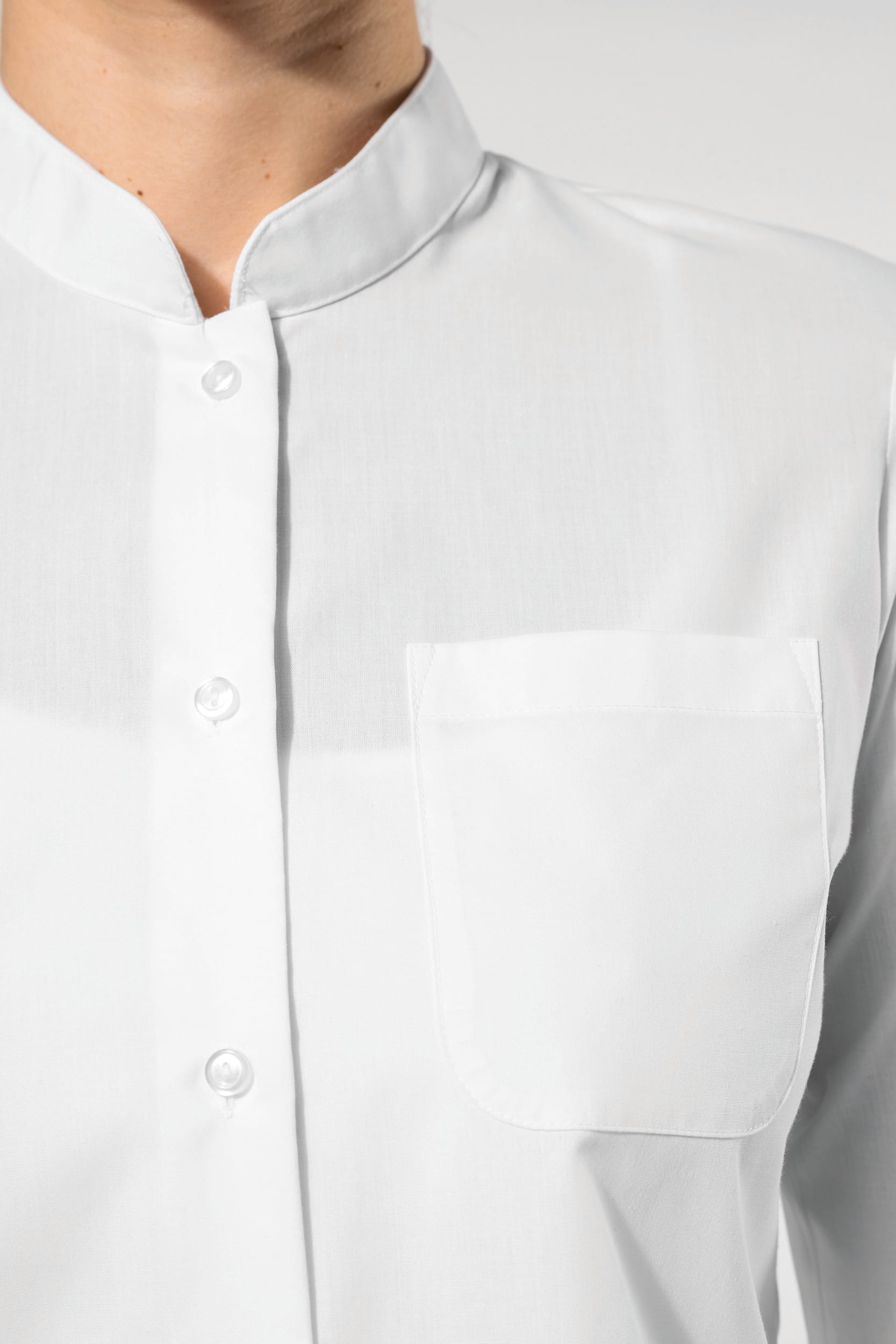 65% Poliestere / 35% Popeline di Cotone. Tessuto facile da stirare. Collo alla coreana. Bottoni colorati. Taschino sul petto a sinistra. Polsini arrotondati regolabili con abbottonatura antistrappo. 1 bottone di riserva. Fondo sagomato.