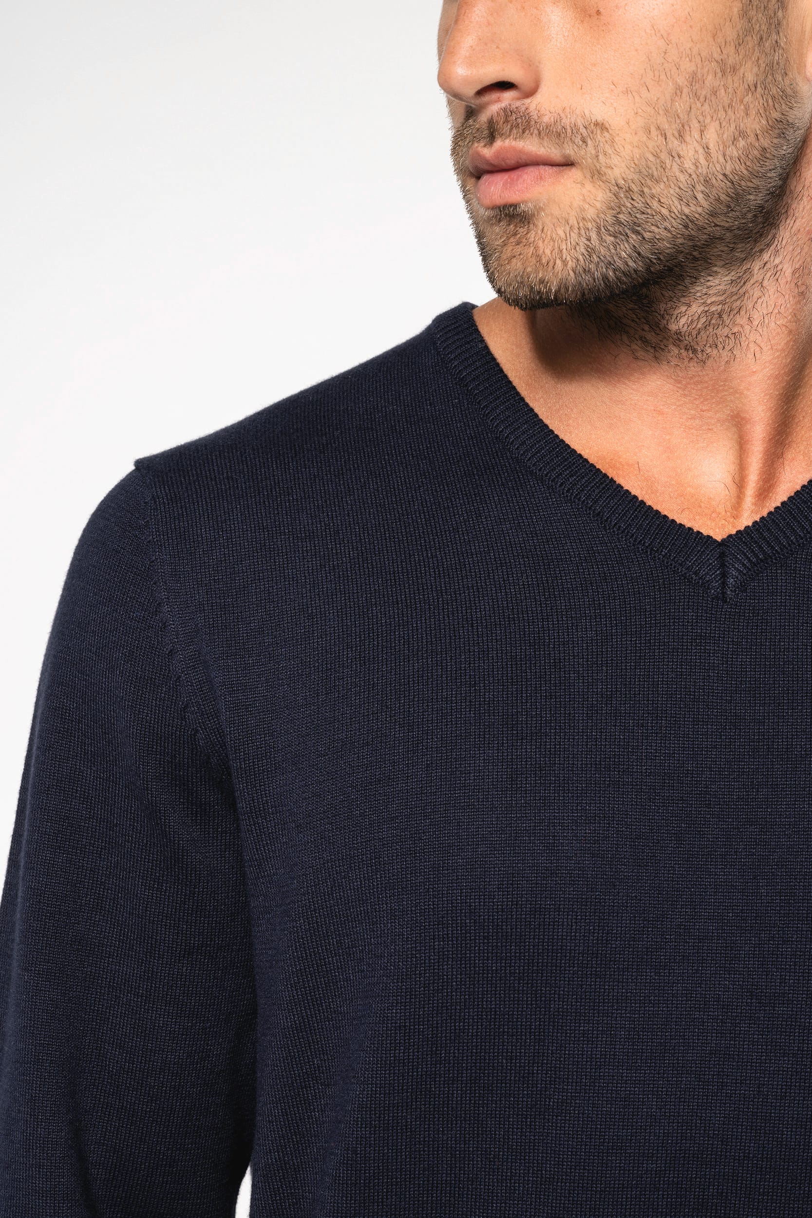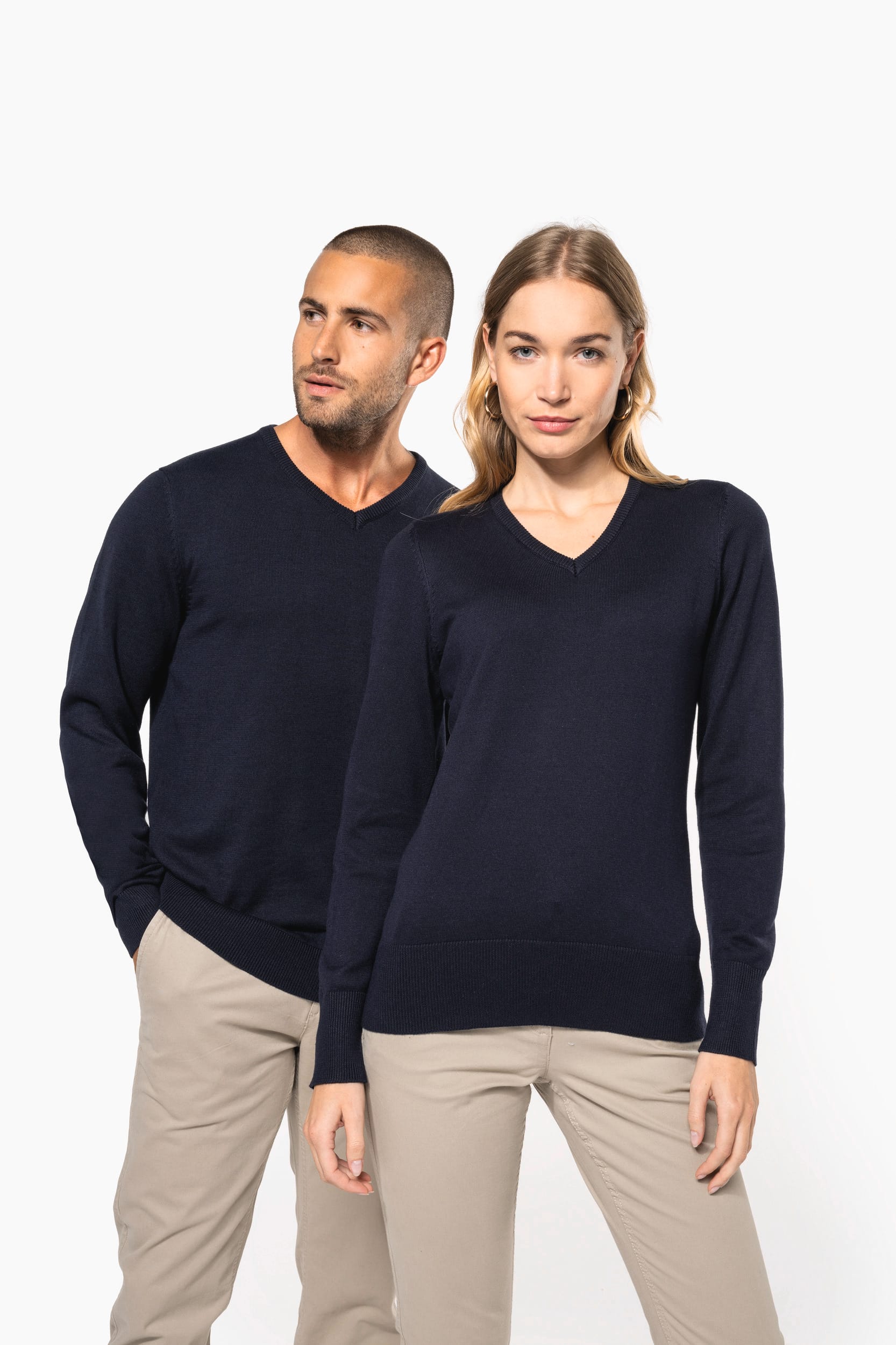 50% cotone / 50% acrilico (calibro 12). Taglio dritto. Collo con costine a doppio strato. Nastrino al collo.