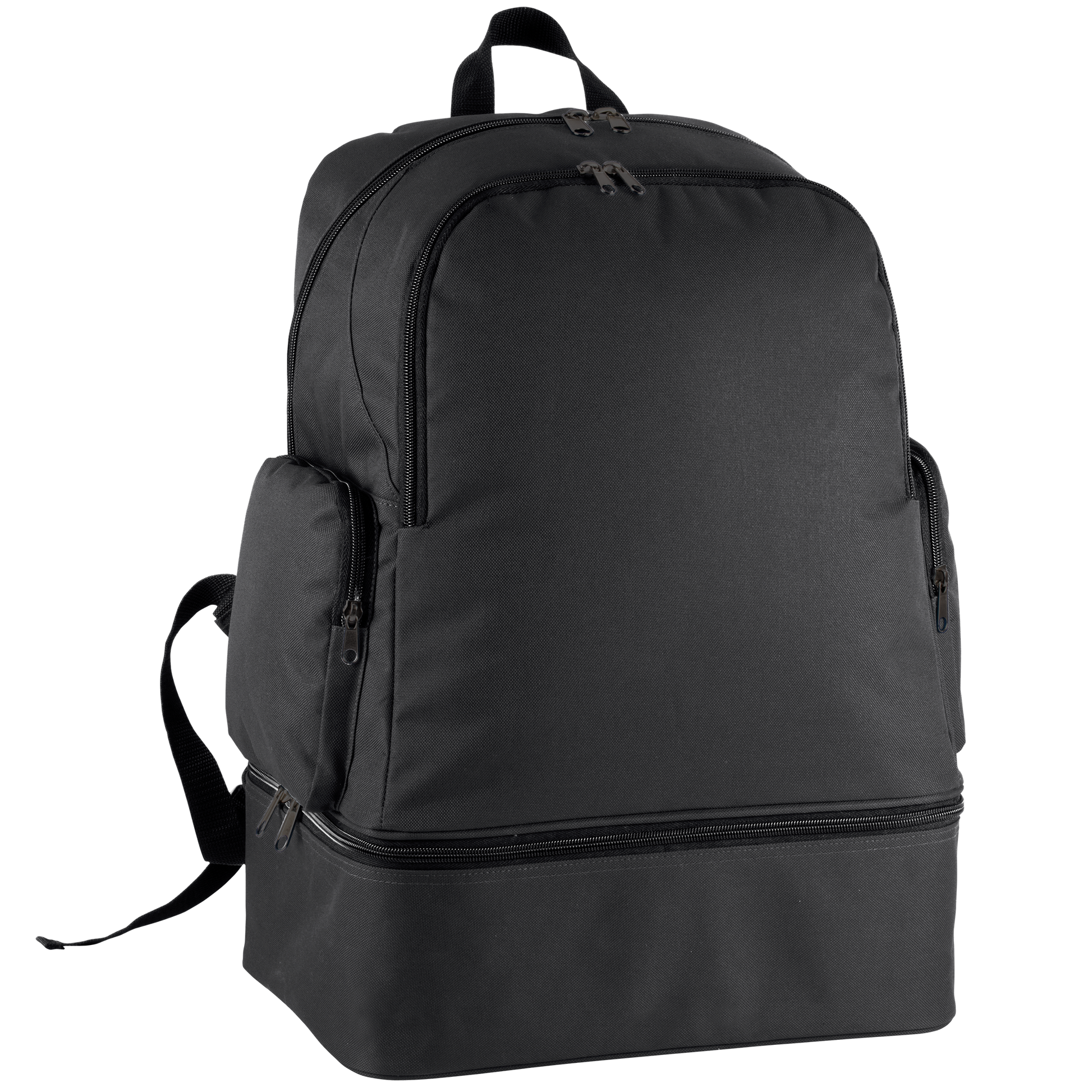 Zaino sport in poliestere 600D. Fondo rigido staccabile in polipropilene con piedini in plastica. Tasca frontale con zip per facilitare la personalizzazione, 2 tasche laterali, porta badge. Fondo rigido in dotazione con lo zaino. 42L