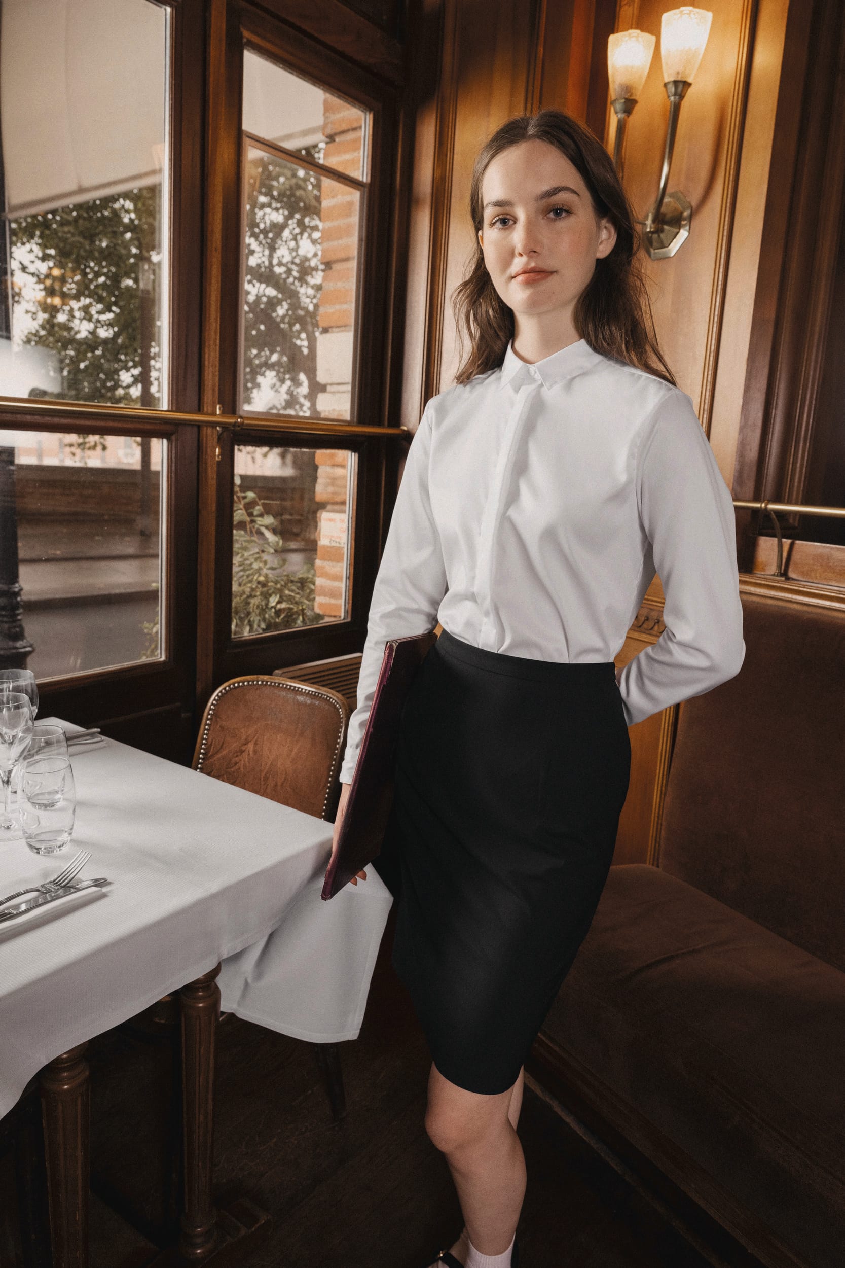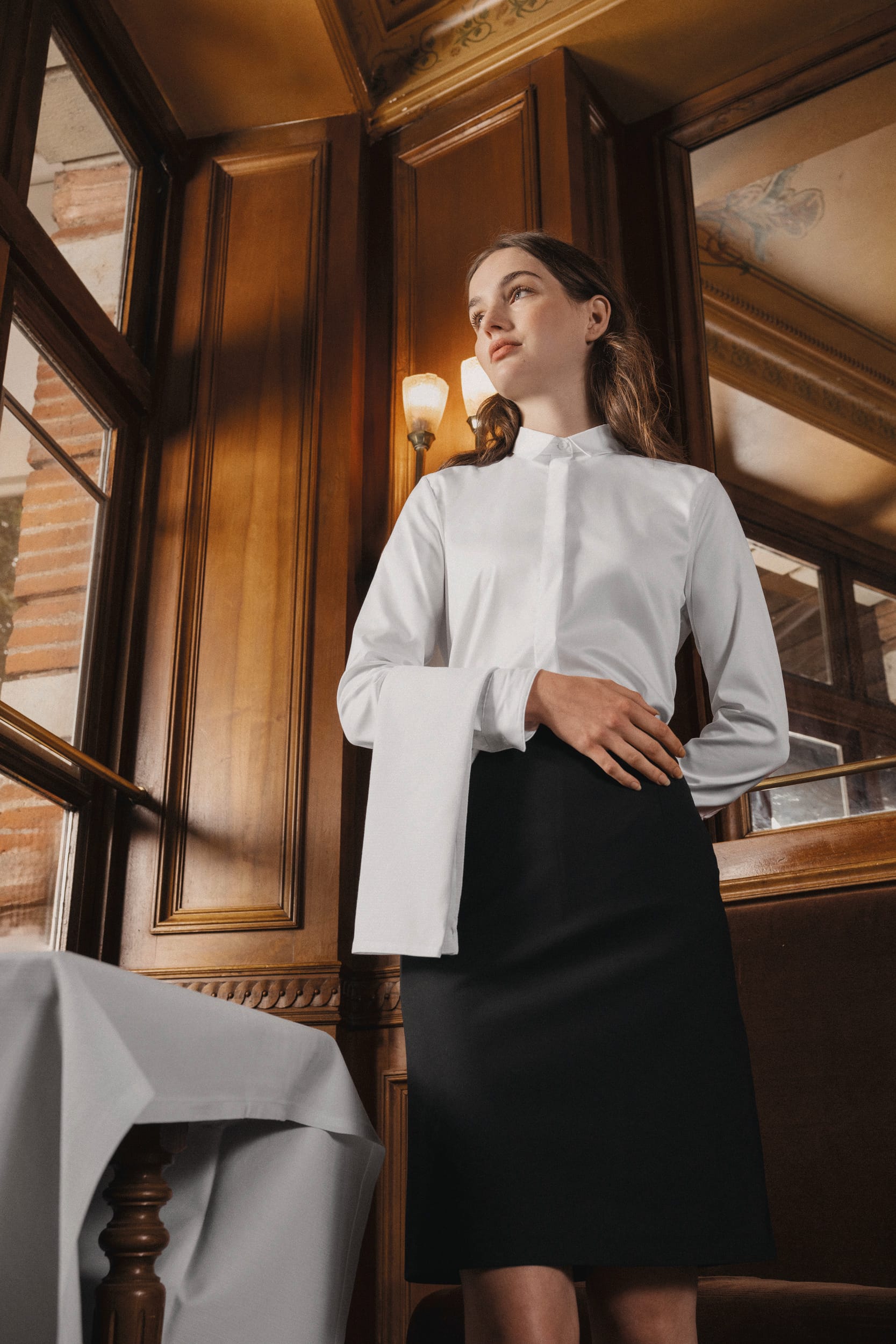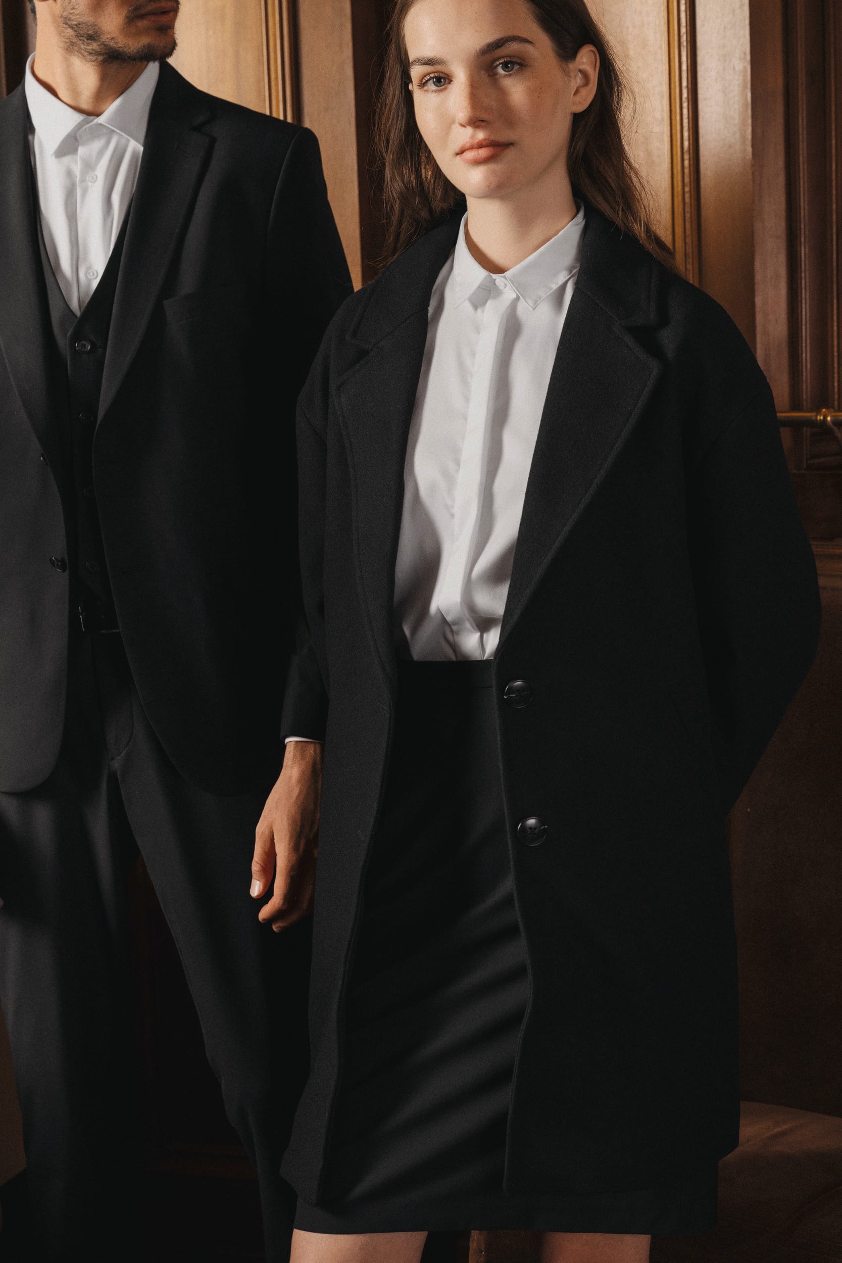 50% poliestere / 23% viscosa / 22% lana / 5% elastan. Fodera 100% poliestere stretch. 2 pince davanti in vita e 2 pince sul retro. Zip di apertura sul retro, protetta all'interno da un sottoponte tenuto in posizione da un bottone per un maggiore comfort. Spacchetto posteriore a fondo gonna, fodera a farfalla con spacchetto. Taglio dritto. Nessuna etichetta con il nome del marchio; solo una piccola etichetta con l'indicazione della taglia per semplificare la personalizzazione.