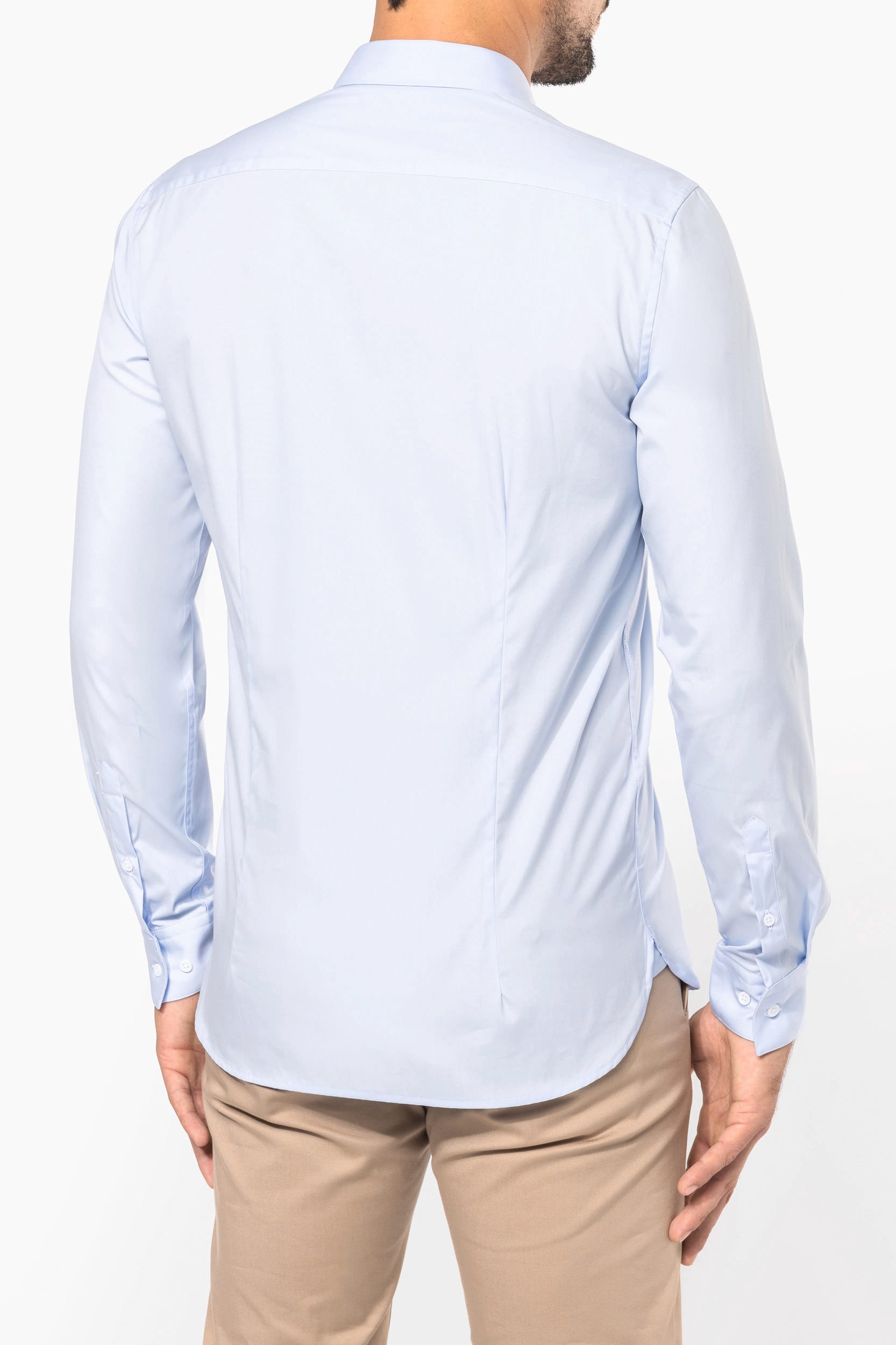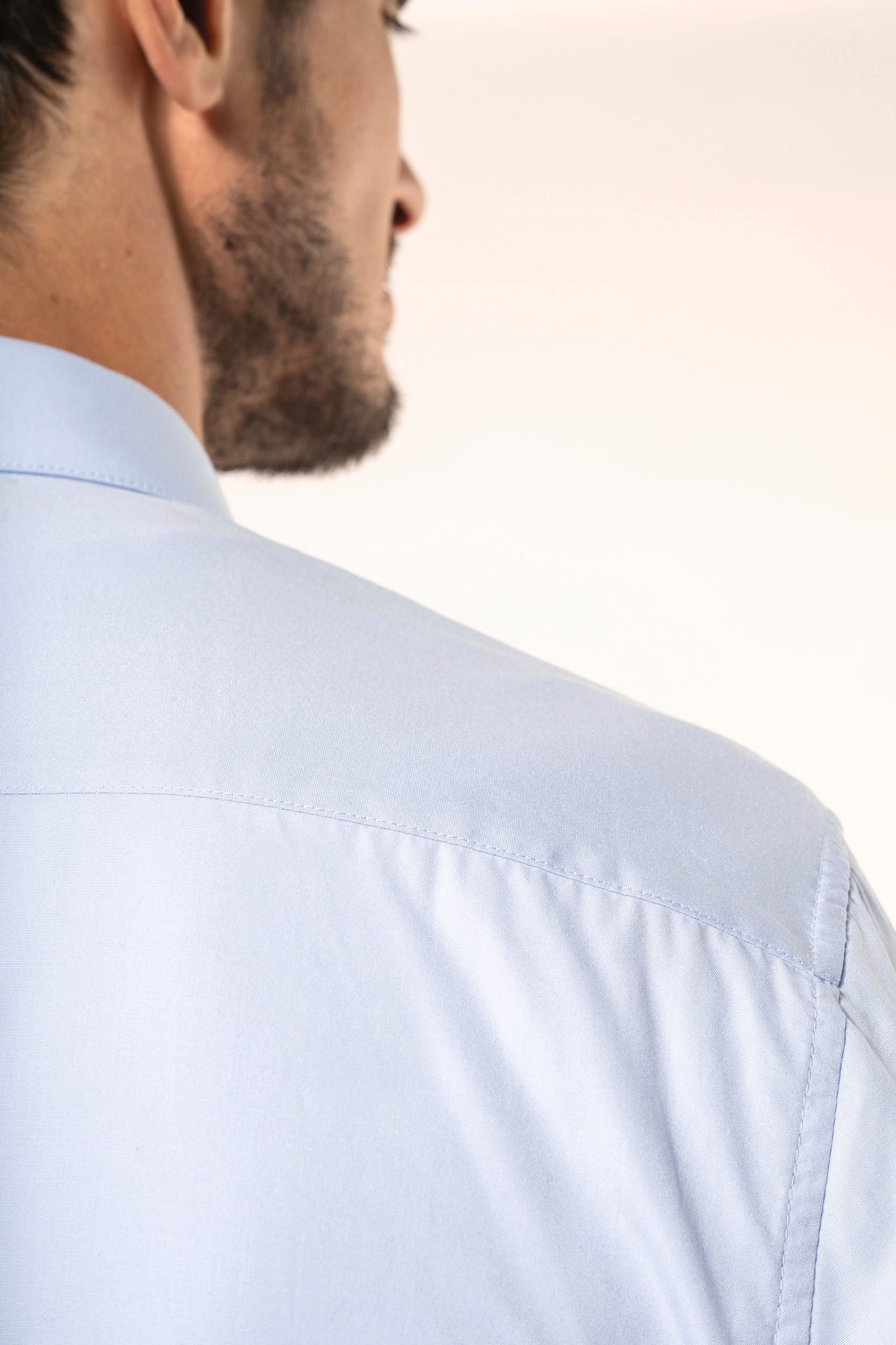 100% cotone. Cotone pettinato. Tessuto popeline. Collo alla francese con stecche rimovibili. Bottoni in madreperla. Inserto sulla parte superiore della schiena. Polsini ad angolo retto con 2 bottoni. Fianchi a coda di rondine. Nessuna etichetta con il nome del marchio; solo un'etichetta con l'indicazione della taglia per semplificare la personalizzazione.